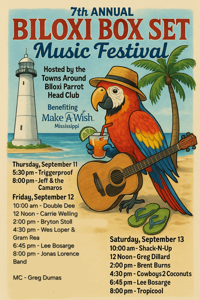 The Biloxi Box Set Music Festival is an annual beachfront music celebration held in Biloxi, Mississippi, celebrating “trop rock”—a laid-back genre blending rock, country, and Caribbean influences, popularized by artists like Jimmy Buffett. Organized by the Towns Around Biloxi Parrot Head Club, the event serves as a major fundraiser for Military Veterans on the Mississippi Gulf Coast, combining entertainment with philanthropy.